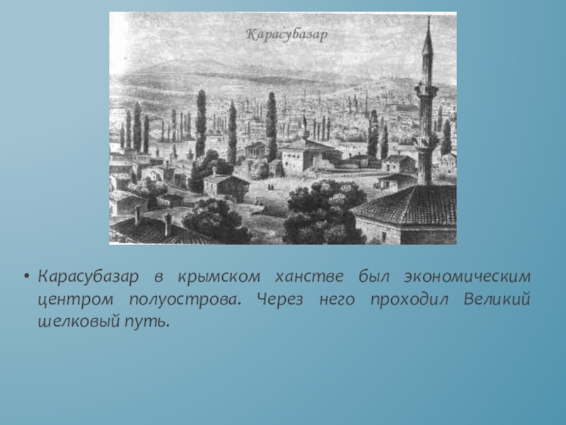 Слайд 4Карасубазар в крымском ханстве был экономическим центром полуострова. Через него проходил