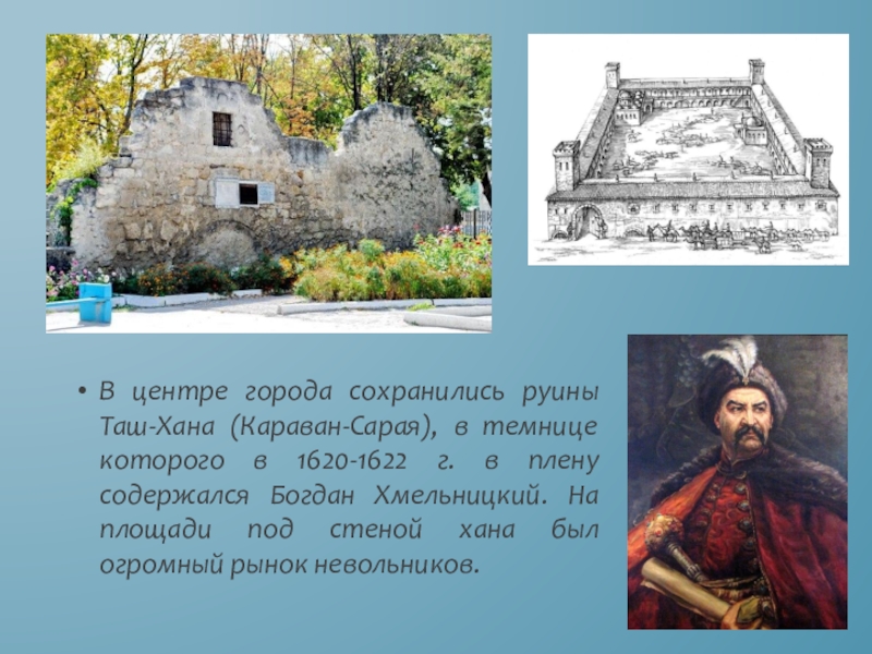 1620-1622 г. в плену содержался Богдан Хмельницкий. На площади под стеной хана был огромный рынок невольников.