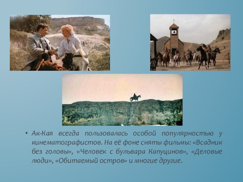 Слайд 8Ак-Кая всегда пользовалась особой популярностью у кинематографистов. На её фоне сняты