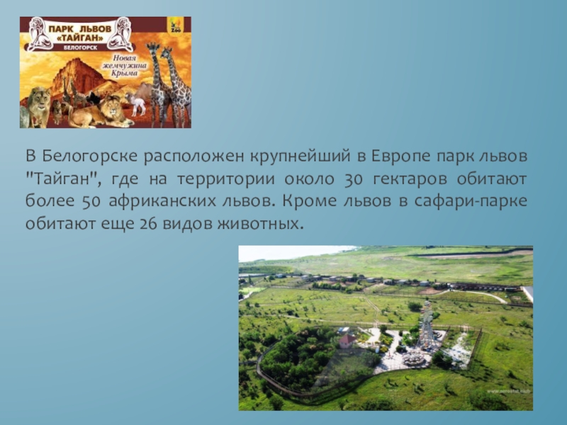 Слайд 10В Белогорске расположен крупнейший в Европе парк львов "Тайган", где на