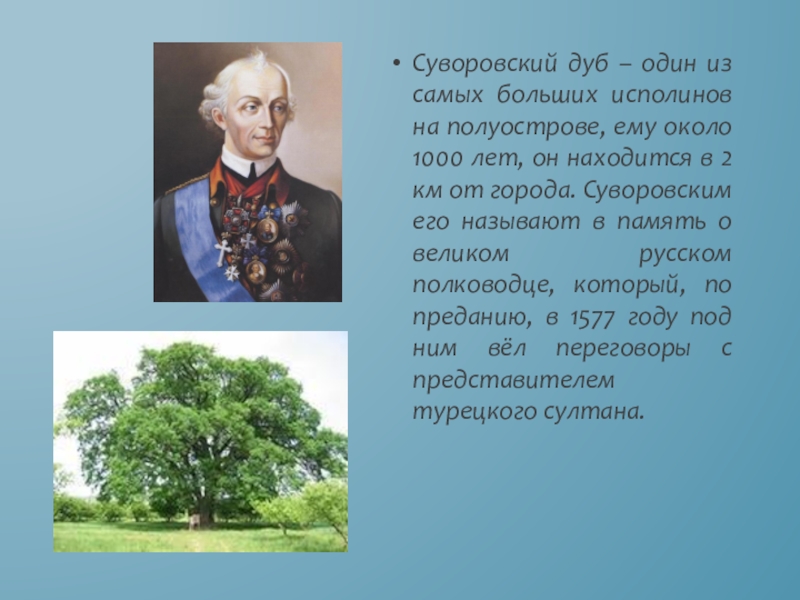 Слайд 7Суворовский дуб – один из самых больших исполинов на полуострове, ему
