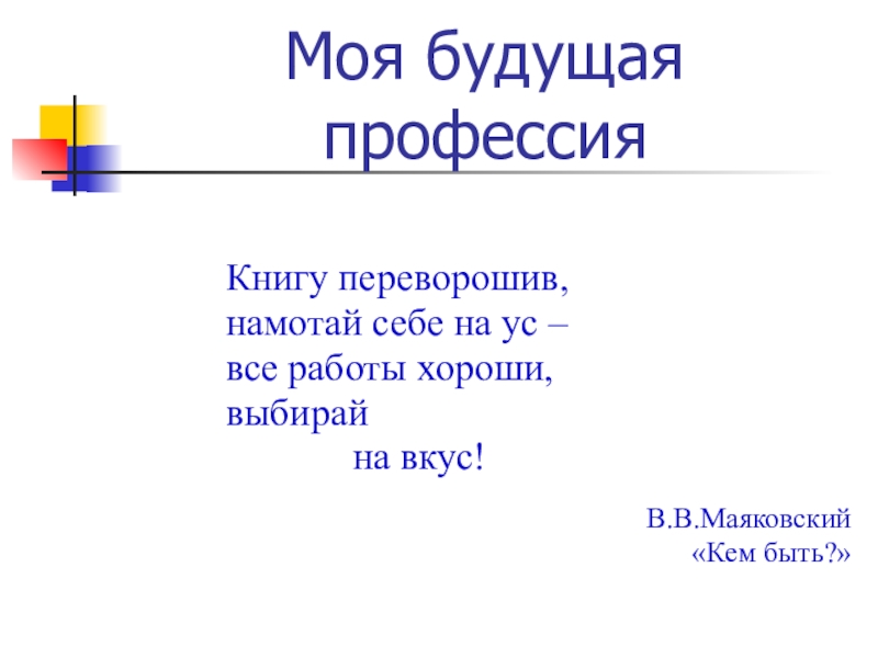 Моя будущая профессияКнигу переворошив,намотай себе на ус – все работы хороши,выбирай