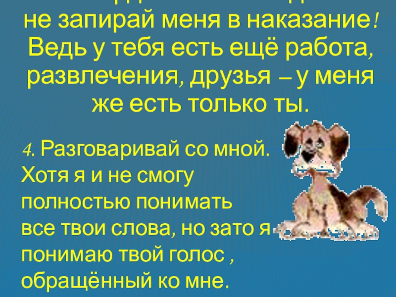 4. Разговаривай со мной. Хотя я и не смогу полностью понимать все твои слова, но зато я понимаю твой голос , обращённый ко мне.