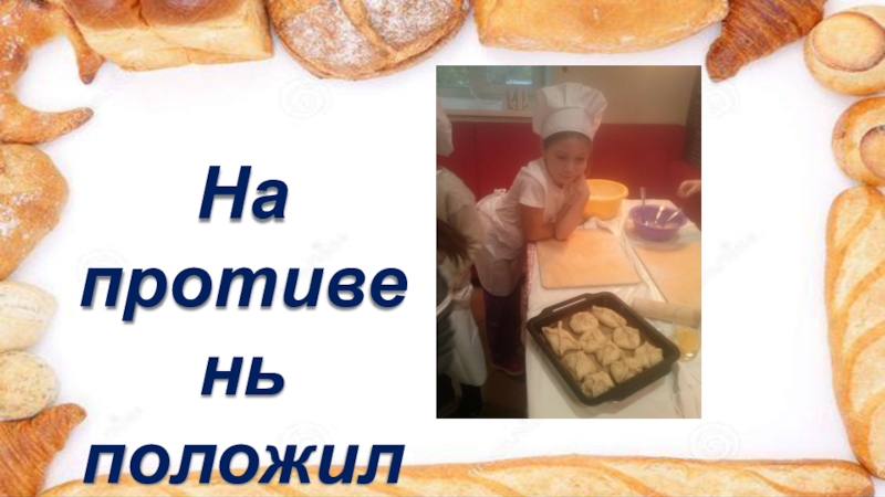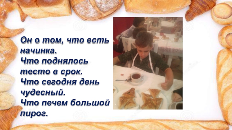 Слайд 13Он о том, что есть начинка. Что поднялось тесто в срок. Что сегодня