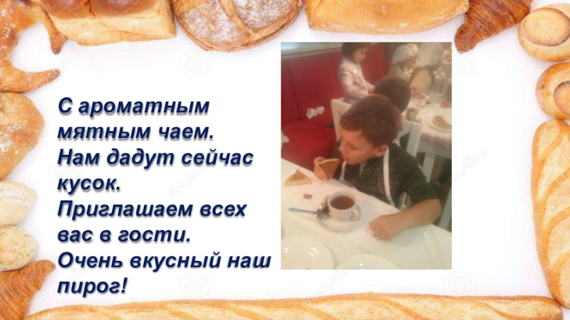Слайд 15С ароматным мятным чаем. Нам дадут сейчас кусок. Приглашаем всех вас в гости. Очень