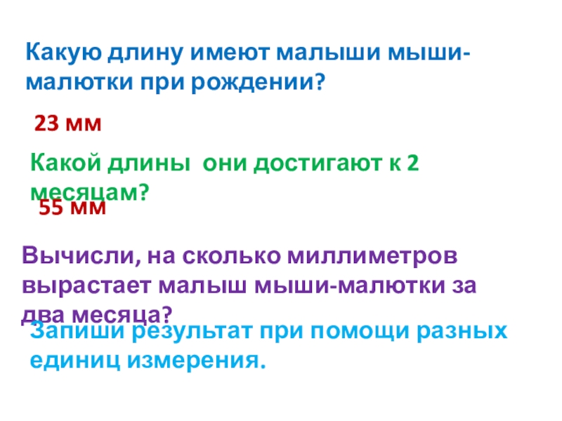 Вычисли, на сколько миллиметров вырастает малыш мыши-малютки за два месяца?