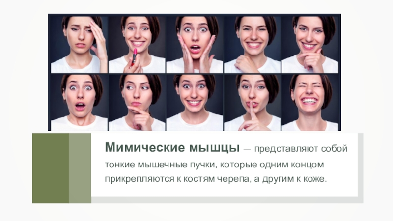 Мимические мышцы — представляют собой тонкие мышечные пучки, которые одним концом прикрепляются к костям черепа, а другим