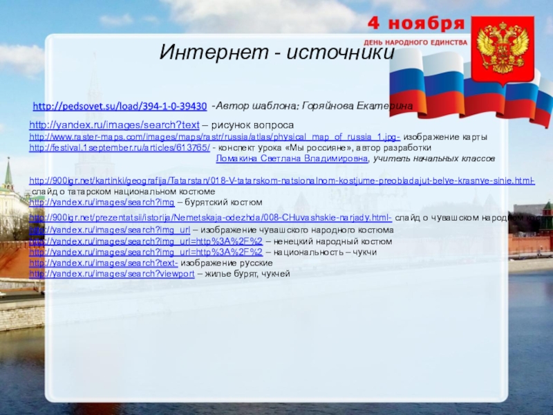 Интернет - источникиhttp://pedsovet.su/load/394-1-0-39430 -Автор шаблона: Горяйнова Екатеринаhttp://yandex.ru/images/search?text – рисунок вопросаhttp://www.raster-maps.com/images/maps/rastr/russia/atlas/physical_map_of_russia_1.jpg- изображение картыhttp://festival.1september.ru/articles/613765/ - конспект урока «Мы россияне», автор