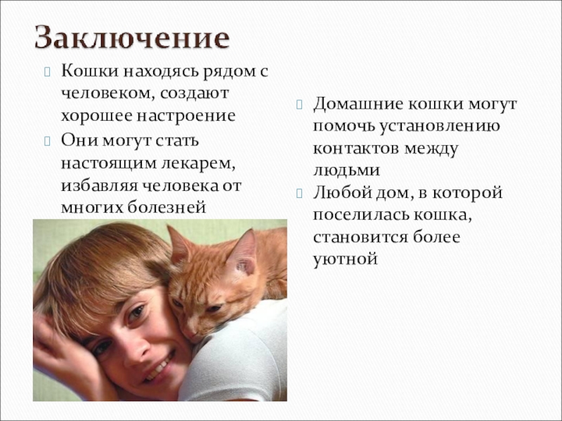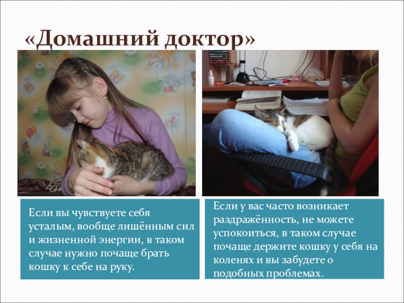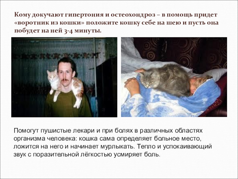 Помогут пушистые лекари и при болях в различных областях организма человека: кошка сама определяет больное место, ложится на него и начинает мурлыкать. Тепло и успокаивающий звук с поразительной лёгкостью усмиряет боль.