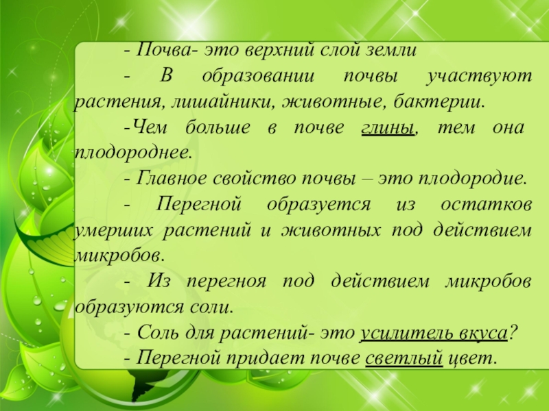 - Перегной образуется из остатков умерших растений и животных под действием микробов.
