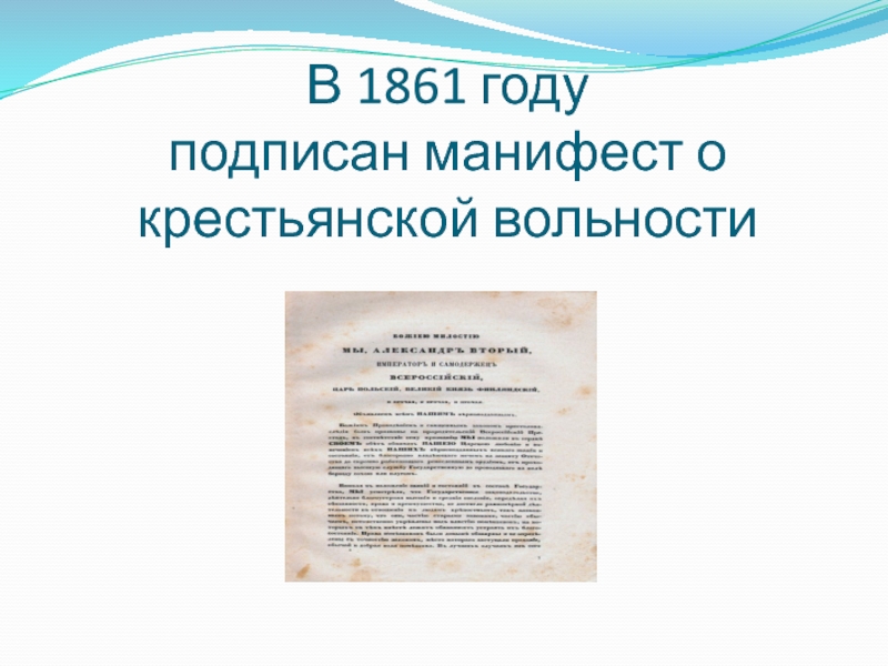 Слайд 3В 1861 году подписан манифест о крестьянской вольности