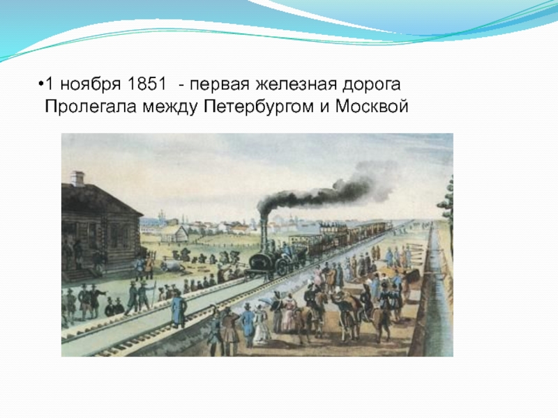 1 ноября 1851 - первая железная дорогаПролегала между Петербургом и Москвой