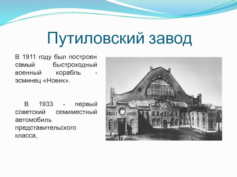 Путиловский завод В 1911 году был построен самый быстроходный военный корабль - эсминец «Новик». В 1933 -