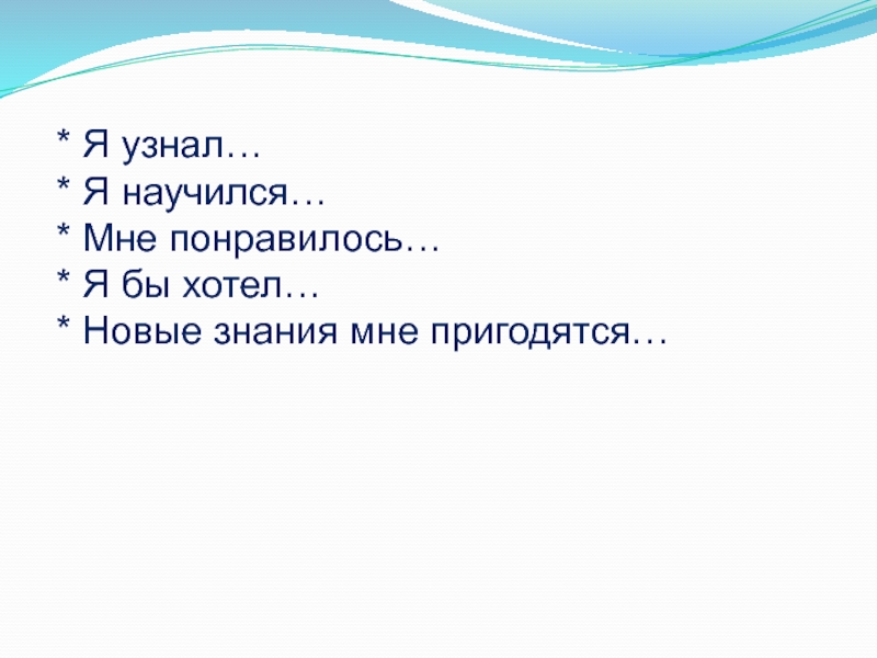 * Я узнал… * Я научился… * Мне понравилось… * Я бы хотел… * Новые знания мне