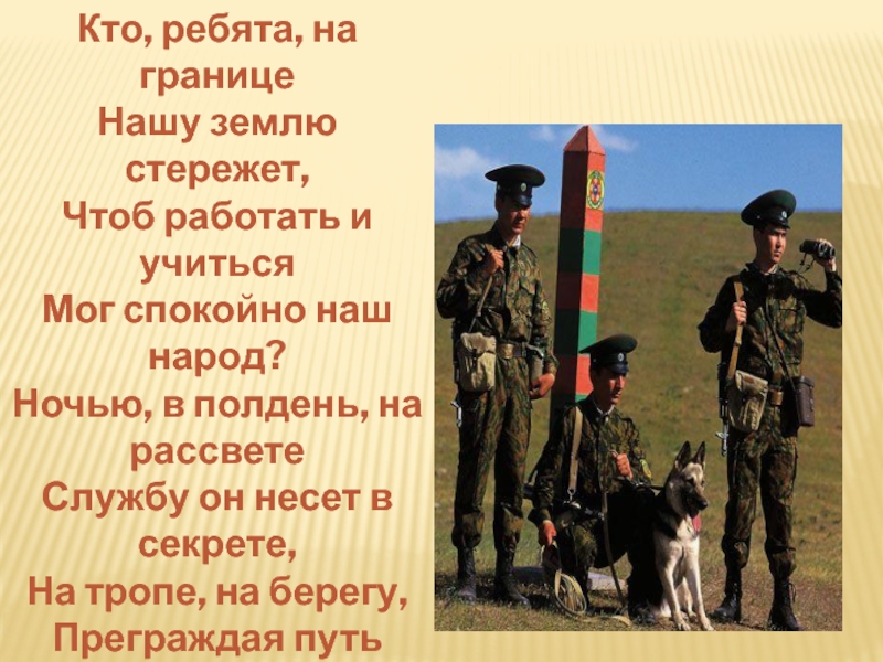 Кто, ребята, на границеНашу землю стережет,Чтоб работать и учитьсяМог спокойно наш народ?Ночью, в полдень, на рассветеСлужбу он