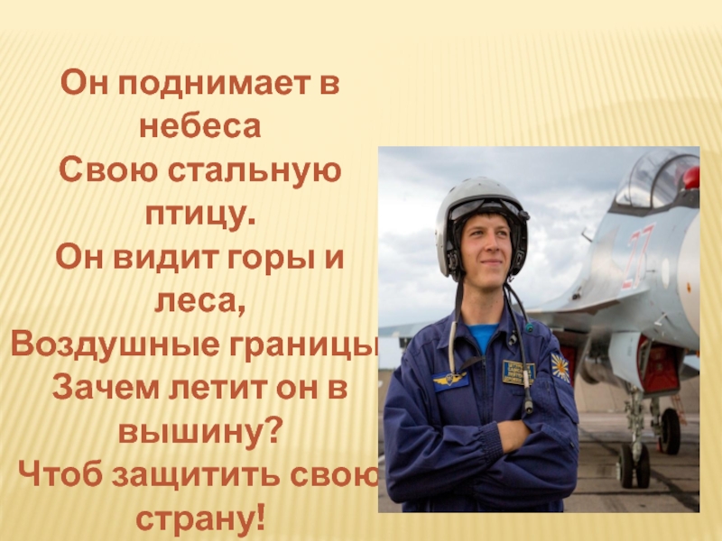 Он поднимает в небесаСвою стальную птицу.Он видит горы и леса, Воздушные границы.Зачем летит он в вышину?Чтоб защитить
