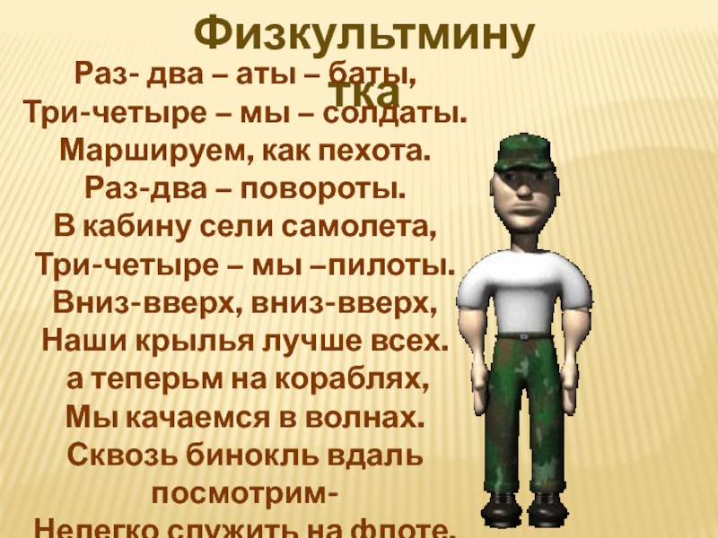 ФизкультминуткаРаз- два – аты – баты,Три-четыре – мы – солдаты.Маршируем, как пехота.Раз-два – повороты.В кабину сели самолета,Три-четыре