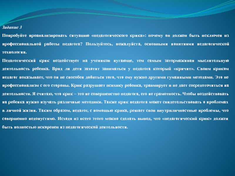 Педагогический крик воздействует на учеников пугающе, тем самым затормаживая мыслительную деятельность ребенка. Вряд ли дети захотят заниматься у педагога который «кричит». Своим криком педагог показывает, что он не способен добиться того, что ему нужно другими гуманными методами. Это не профессионализм с его стороны. Крик разрушает психику ребенка, травмирует и не дает сосредоточиться на деятельности. Я считаю, что крик – это не совершенство педагога, его не грамотность. Чтобы воздействовать на ребенка нужно изучать различные методики. Также крик педагога может свидетельствовать о проблемах в личной жизни. Таким образом, педагог, с помощью крика, решает свои внутриличностные проблемы, что совершенно недопустимо. Исходя из всего этого можно сделать вывод, что «педагогический крик» должен быть полностью искоренен из педагогической деятельности.