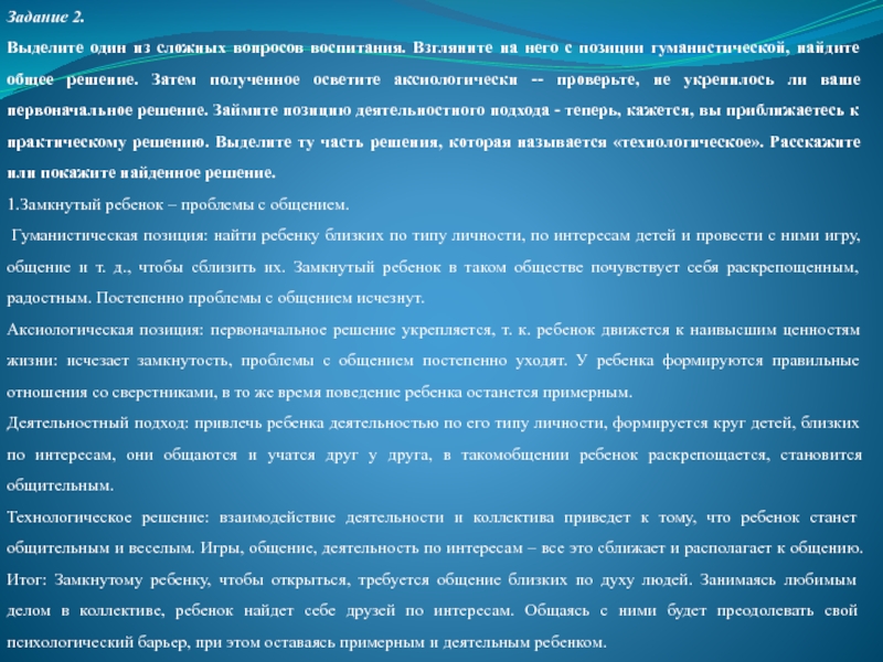 позиции гуманистической, найдите общее решение. Затем полученное осветите аксиологически -- проверьте, не укрепилось ли ваше первоначальное решение. Займите позицию деятельностного подхода - теперь, кажется, вы приближаетесь к практическому решению. Выделите ту часть решения, которая называется «технологическое». Расскажите или покажите найденное решение.