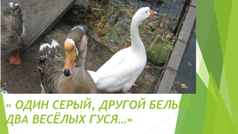 Слайд 3« ОДИН СЕРЫЙ, ДРУГОЙ БЕЛЫЙ, ДВА ВЕСЁЛЫХ ГУСЯ…»