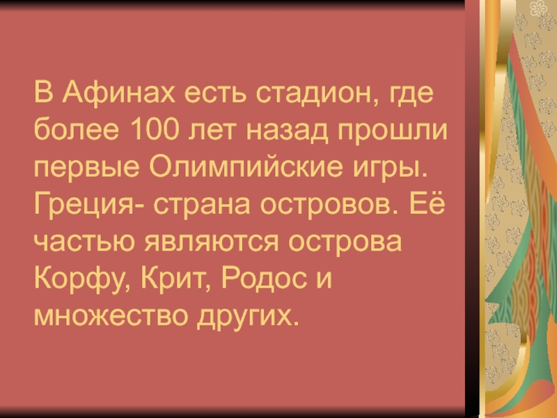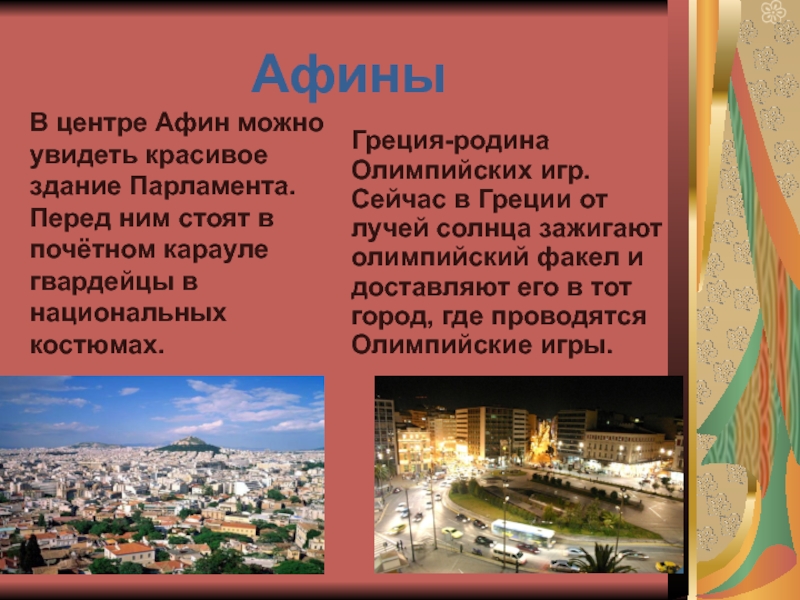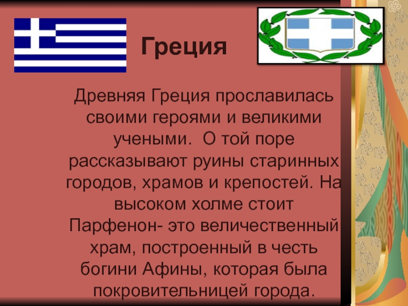 Греция-родина Олимпийских игр. Сейчас в Греции от лучей солнца зажигают олимпийский факел и доставляют его в тот город, где проводятся Олимпийские игры.