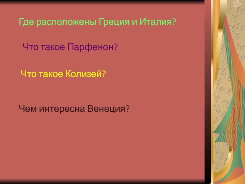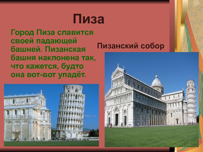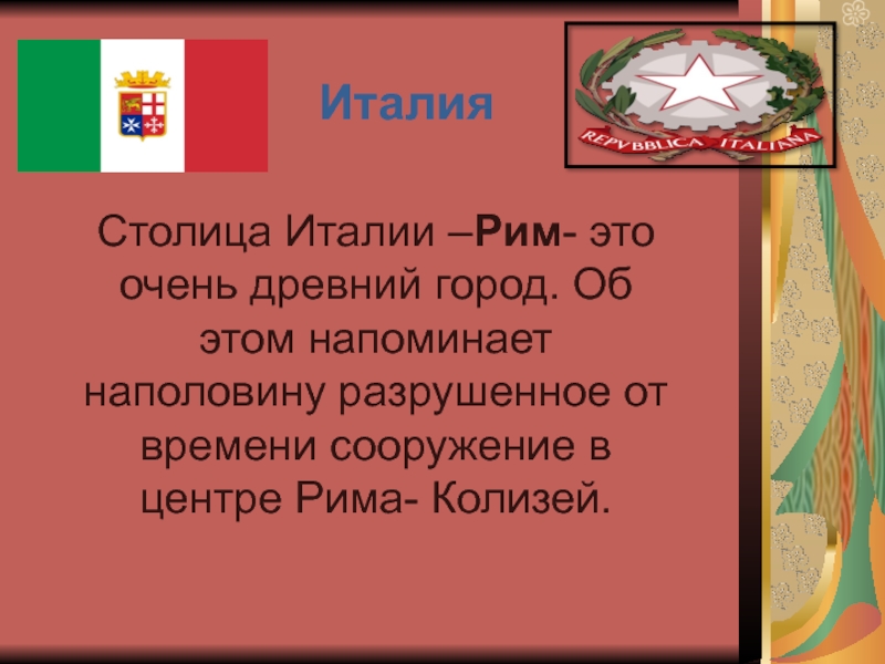 Рим очень красивый город. Здесь много фонтанов и дворцов. Располагается государство-город Ватикан. Это самое маленькое в мире государство. Им управляет Папа Римский.
