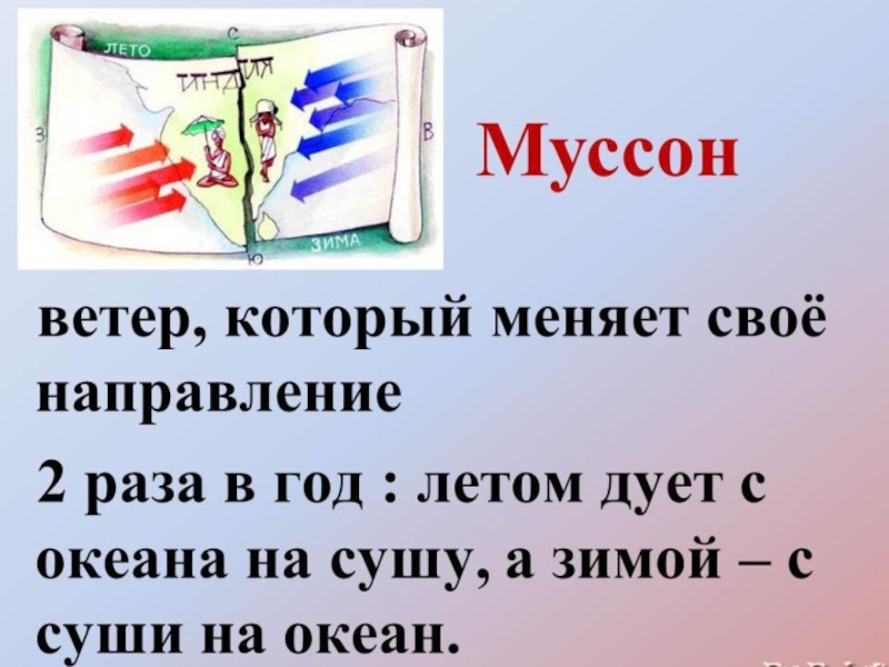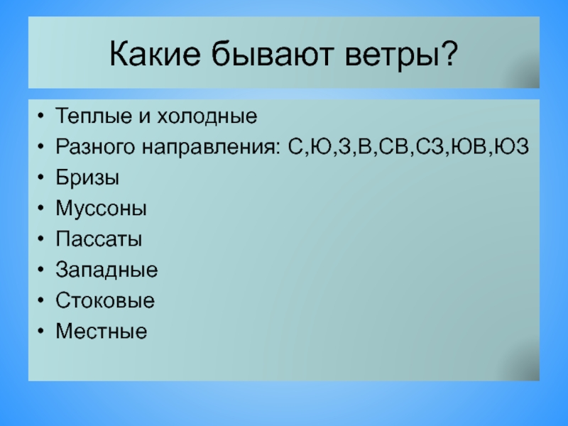Какие бывают ветры?Теплые и холодныеРазного направления: С,Ю,З,В,СВ,СЗ,ЮВ,ЮЗБризыМуссоныПассатыЗападныеСтоковыеМестные