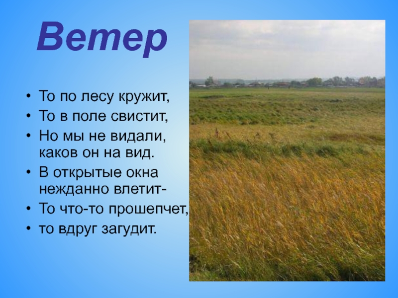 ВетерТо по лесу кружит,То в поле свистит,Но мы не видали, каков он на вид.В открытые окна нежданно влетит-То что-то прошепчет, то вдруг загудит.