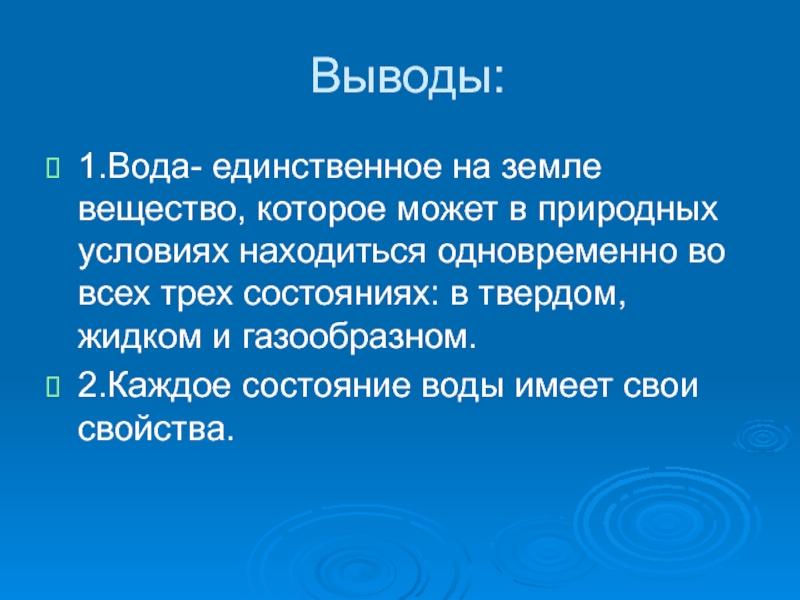 Выводы:1.Вода- единственное на земле вещество, которое может в природных условиях находиться одновременно во всех трех состояниях: в