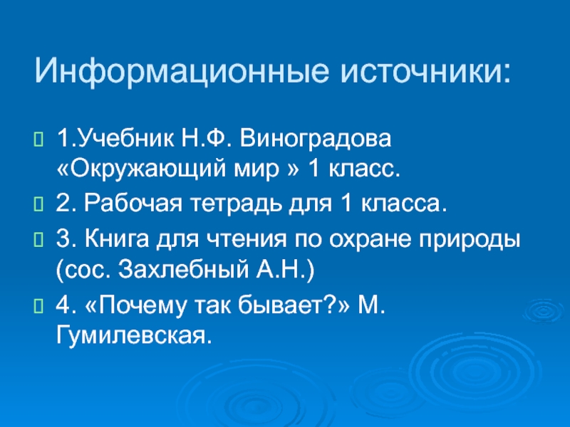 Информационные источники:1.Учебник Н.Ф. Виноградова «Окружающий мир » 1 класс.2. Рабочая тетрадь для 1 класса.3. Книга для чтения