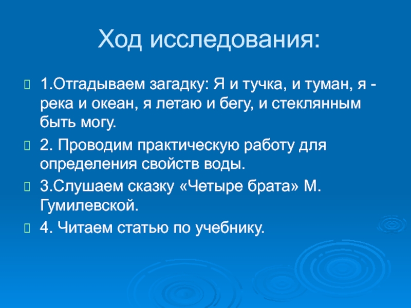 Ход исследования:1.Отгадываем загадку: Я и тучка, и туман, я -река и океан, я летаю и бегу, и
