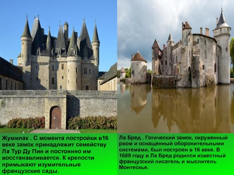Ла Бред . Готический замок, окруженный рвом и оснащенный оборонительными системами, был построен в 16 веке. В 1689 году в Ла Бред родился известный французский писатель и мыслитель Монтескье.