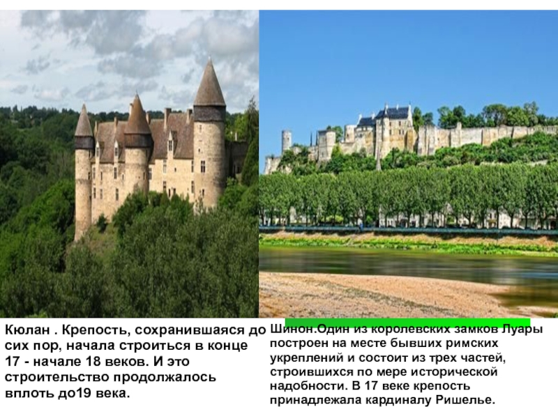 Шинон.Один из королевских замков Луары построен на месте бывших римских укреплений и состоит из трех частей, строившихся по мере исторической надобности. В 17 веке крепость принадлежала кардиналу Ришелье.