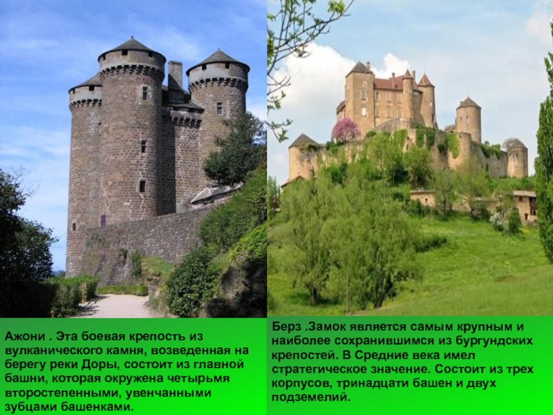 Берз .Замок является самым крупным и наиболее сохранившимся из бургундских крепостей. В Средние века имел стратегическое значение. Состоит из трех корпусов, тринадцати башен и двух подземелий.