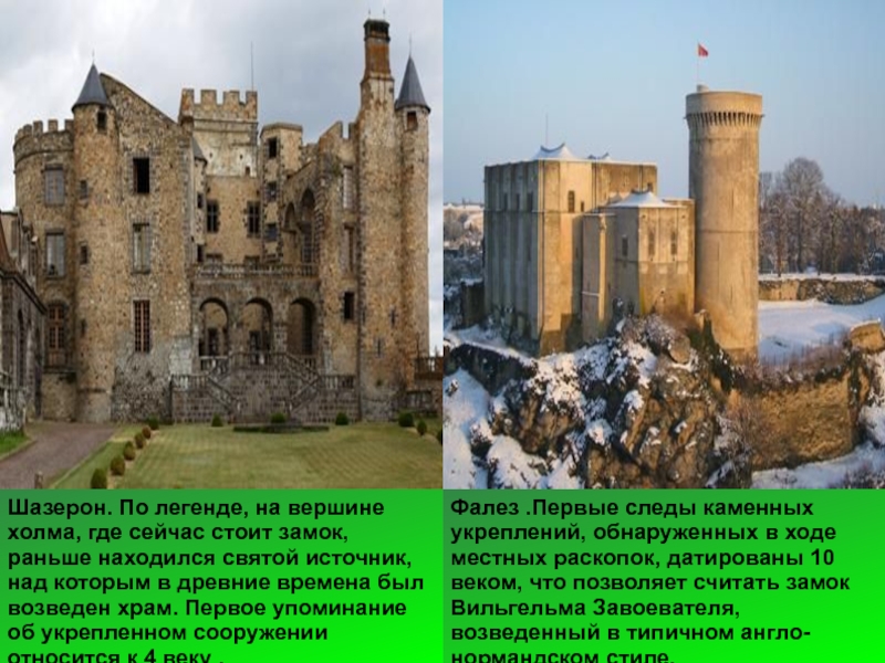 Фалез .Первые следы каменных укреплений, обнаруженных в ходе местных раскопок, датированы 10 веком, что позволяет считать замок Вильгельма Завоевателя, возведенный в типичном англо-нормандском стиле.