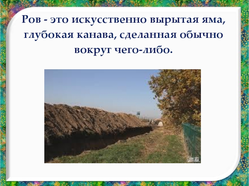 Слайд 12Ров - это искусственно вырытая яма, глубокая канава, сделанная обычно вокруг