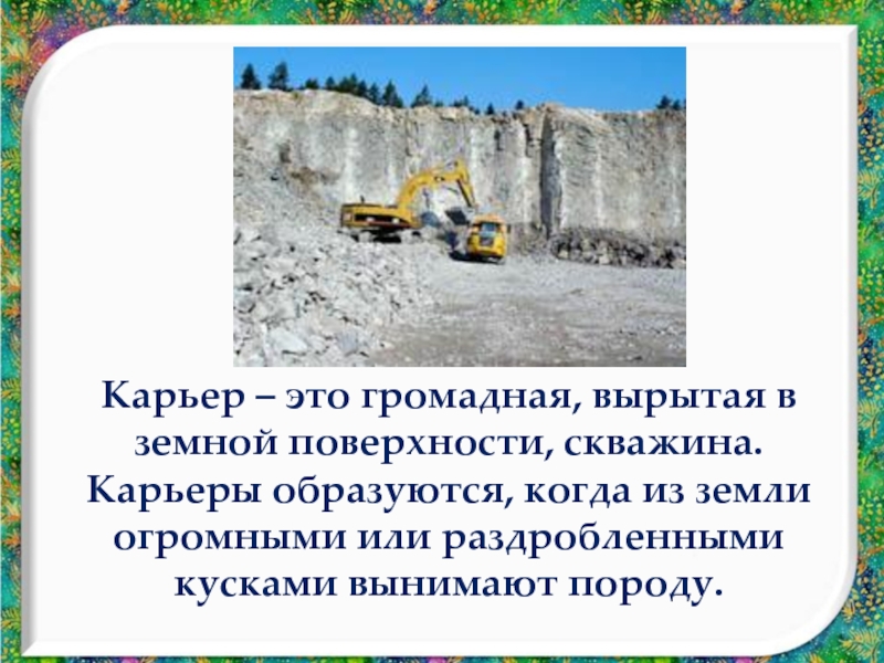 Слайд 9Карьер – это громадная, вырытая в земной поверхности, скважина. Карьеры образуются,