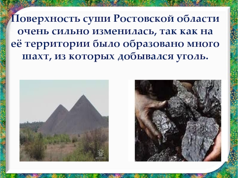 Поверхность суши Ростовской области очень сильно изменилась, так как на её территории было образовано много шахт, из