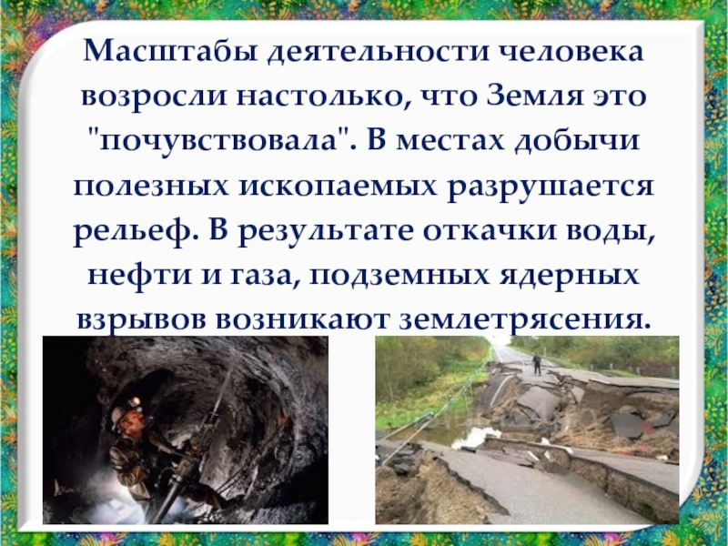 Слайд 11Масштабы деятельности человека возросли настолько, что Земля это "почувствовала". В местах
