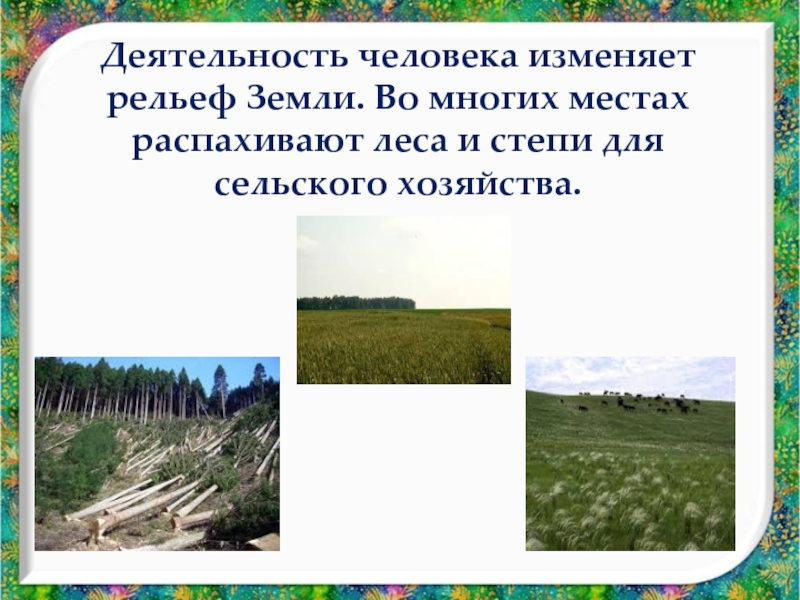 Слайд 5Деятельность человека изменяет рельеф Земли. Во многих местах распахивают леса и