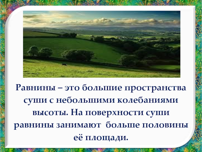 Слайд 3Равнины – это большие пространства суши с небольшими колебаниями высоты. На
