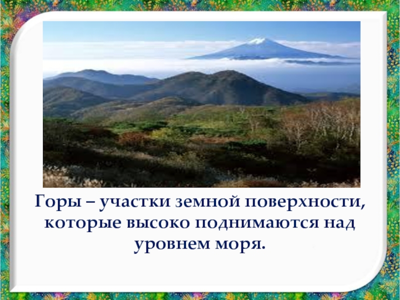 Слайд 4Горы – участки земной поверхности, которые высоко поднимаются над уровнем моря.