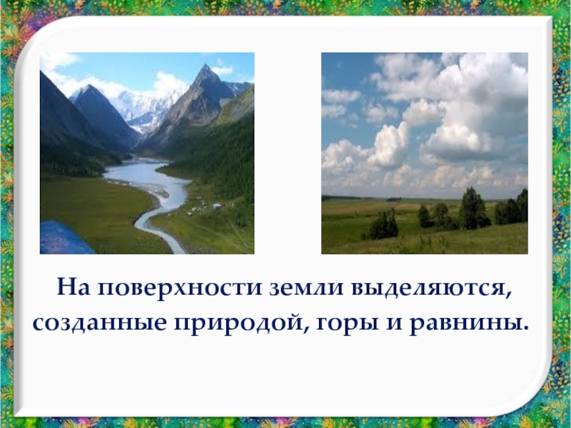 Слайд 2 На поверхности земли выделяются, созданные природой, горы и равнины.
