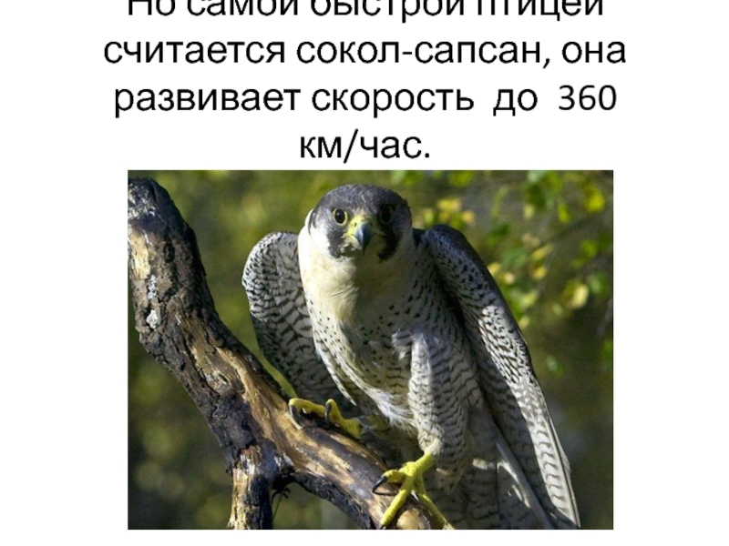Слайд 12Но самой быстрой птицей считается сокол-сапсан, она развивает скорость до 360