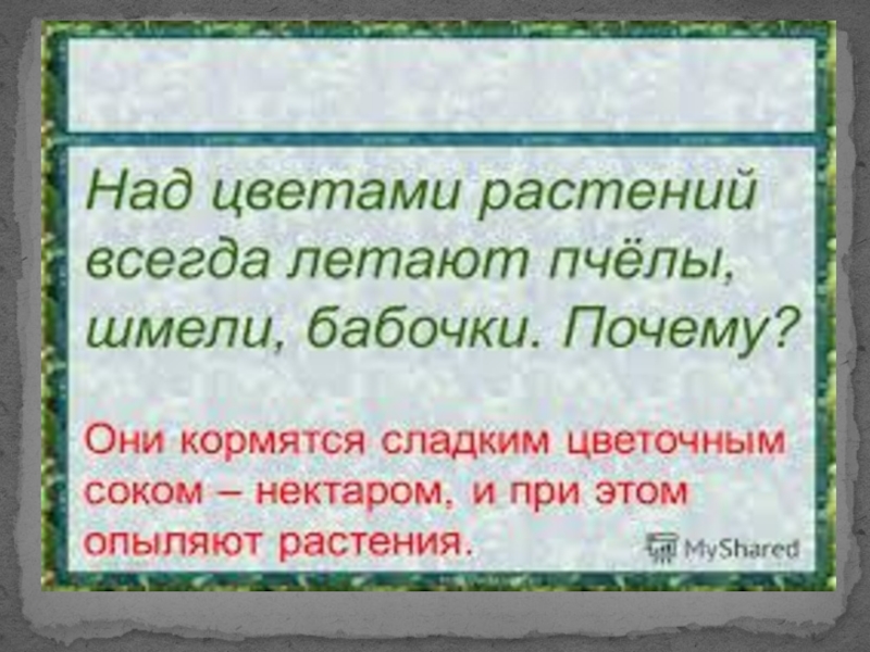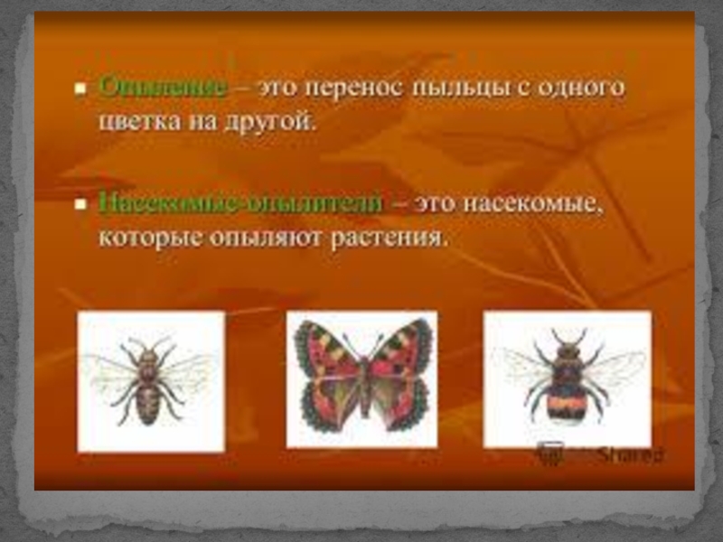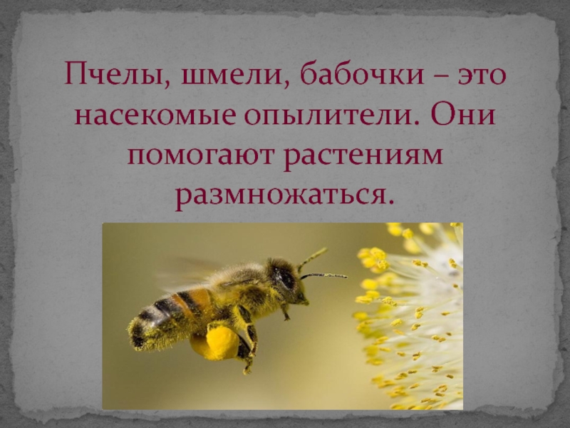 Пчелы, шмели, бабочки – это насекомые опылители. Они помогают растениям размножаться.