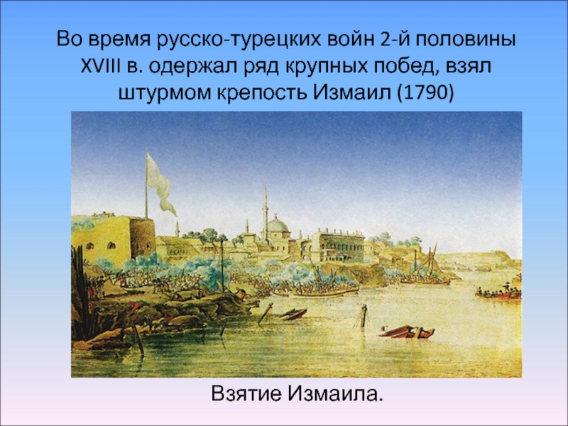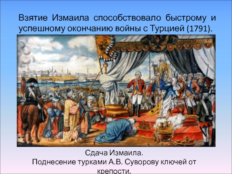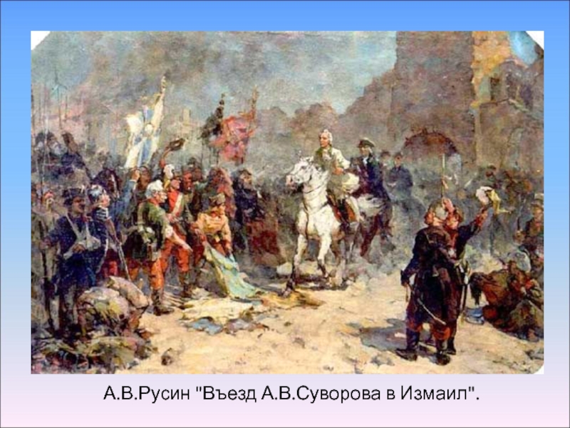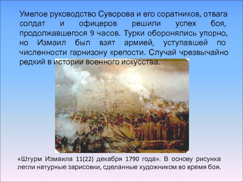 Умелое руководство Суворова и его соратников, отвага солдат и офицеров решили успех боя, продолжавшегося 9 часов. Турки оборонялись упорно, но Измаил был взят армией, уступавшей по численности гарнизону крепости. Случай чрезвычайно редкий в истории военного искусства.