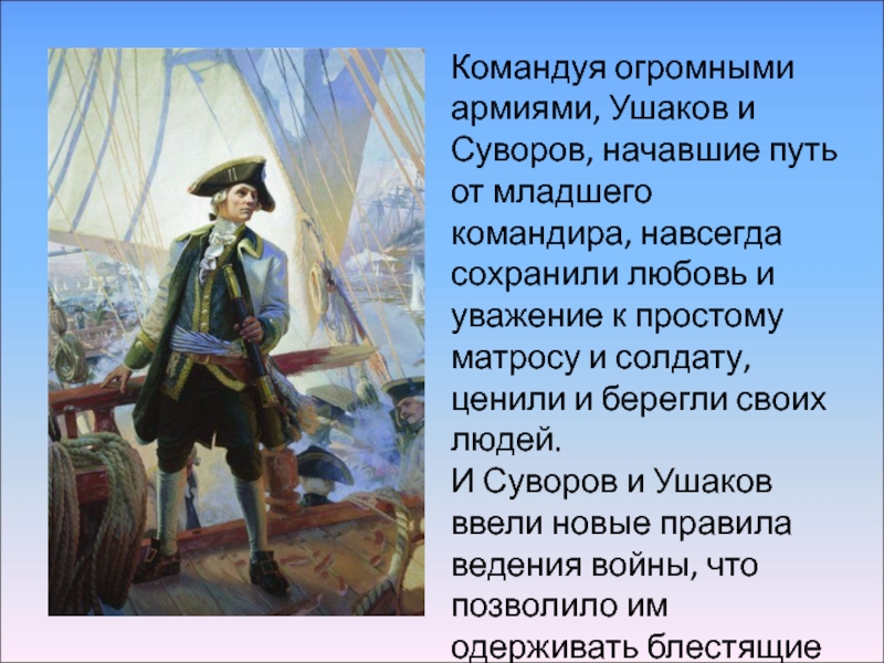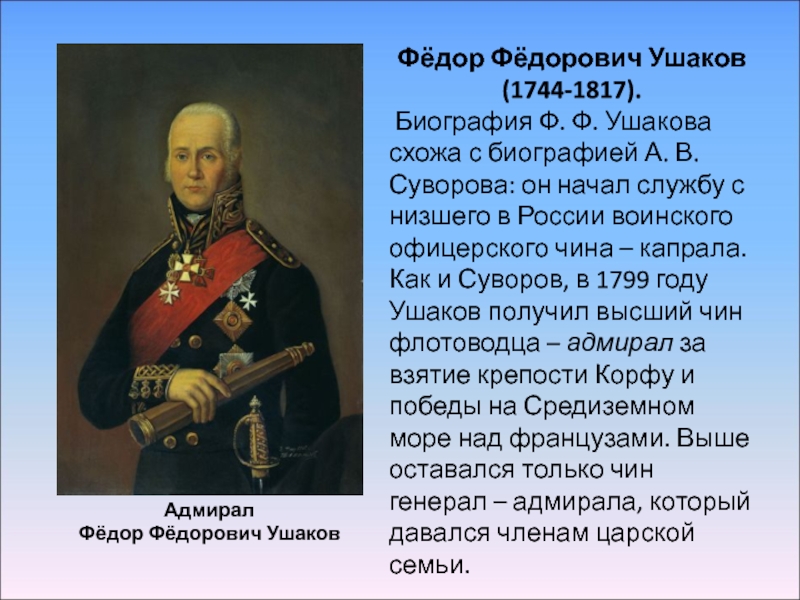 Феодор Ушаков был выдающимся государственным деятелем. Вся его жизнь была отдана России. Он преданно служил благу своего народа, державному достоинству своей Родины.