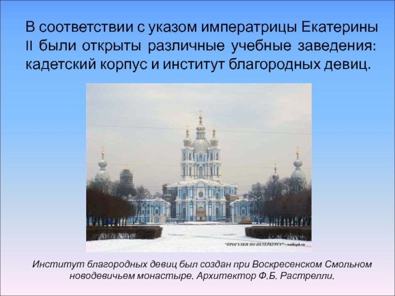 Институт благородных девиц был создан при Воскресенском Смольном новодевичьем монастыре. Архитектор Ф.Б. Растрелли.