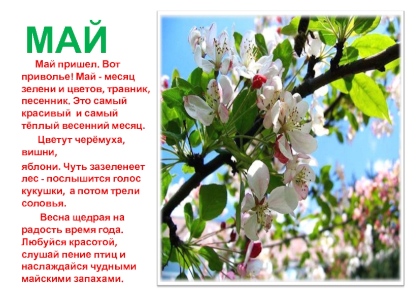 и цветов, травник, песенник. Это самый красивый и самый тёплый весенний месяц.