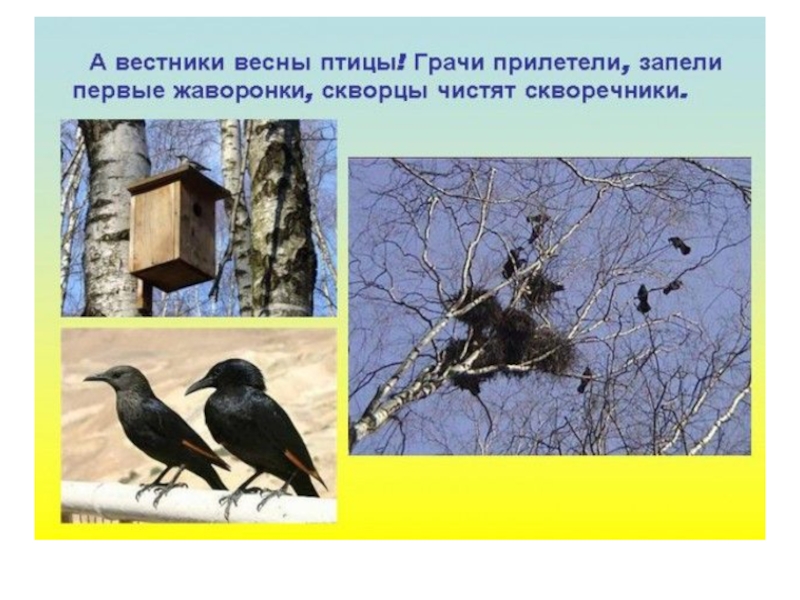 Все перелётные птицы вернулись домой из тёплых стран, хлопочут на гнёздах, песни распевают.